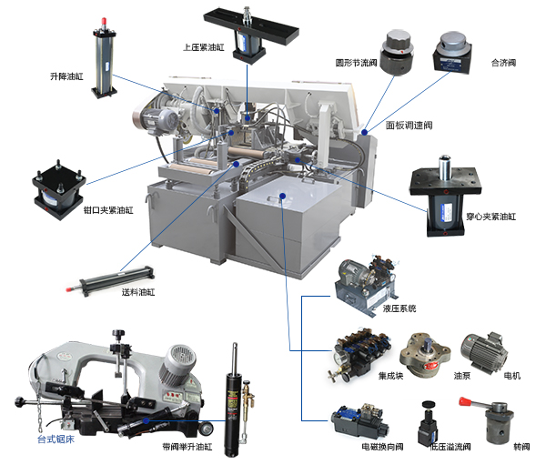 液壓缸專(zhuān)為帶鋸床配套所用,液壓閥由于功能不同,帶鋸床設(shè)功能計(jì)不同可選用不同的液壓閥,請(qǐng)?jiān)O(shè)計(jì)人員選用。