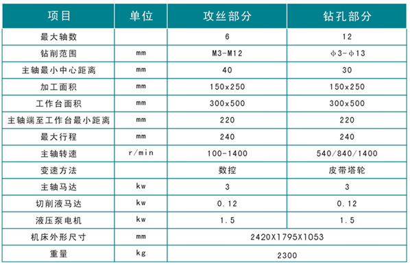 QK5413*12鉆攻兩用組合機(jī)床,在ZK5213系列產(chǎn)品上增加多軸攻絲機(jī)床,采用全自動(dòng)PLC控制,光柵尺和伺服電機(jī)精密控制進(jìn)給深度,操作界面簡(jiǎn)單易用。采用深孔加工程序,實(shí)現(xiàn)多段進(jìn)給多次排屑。